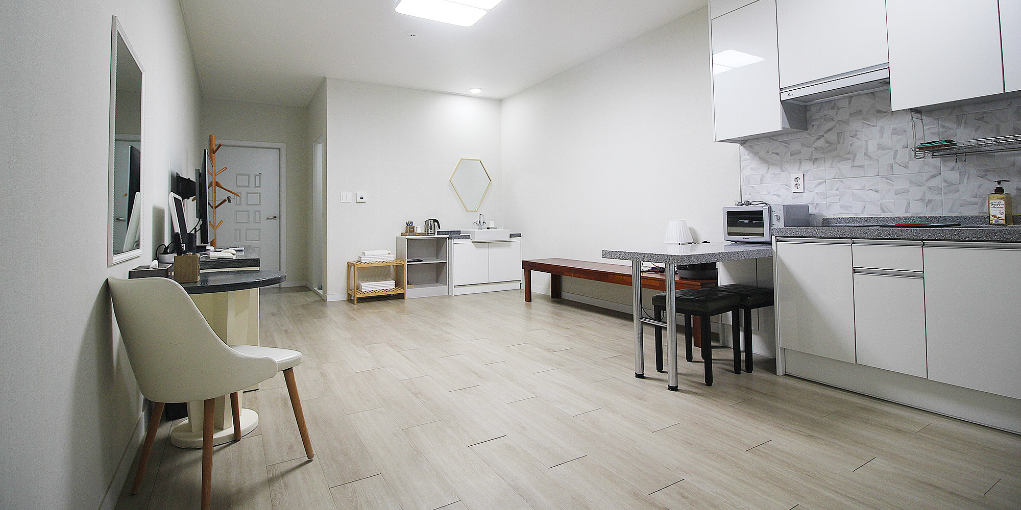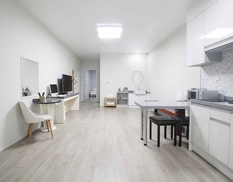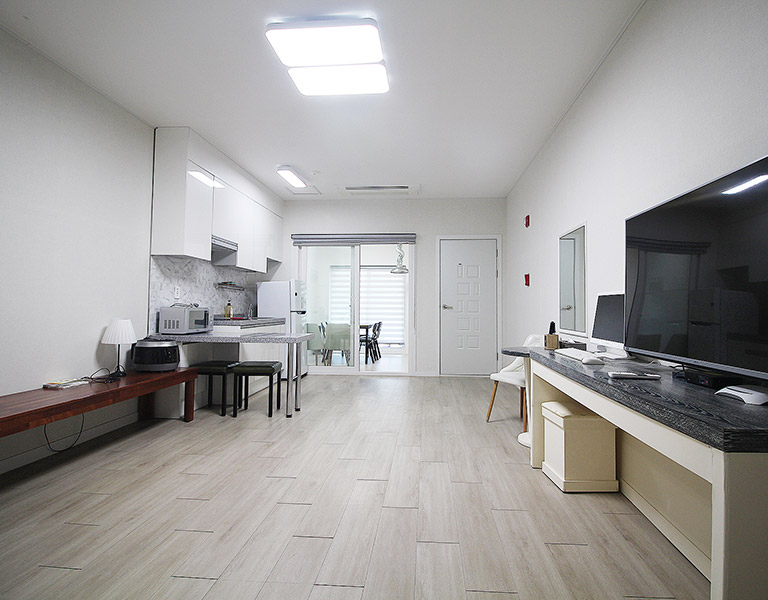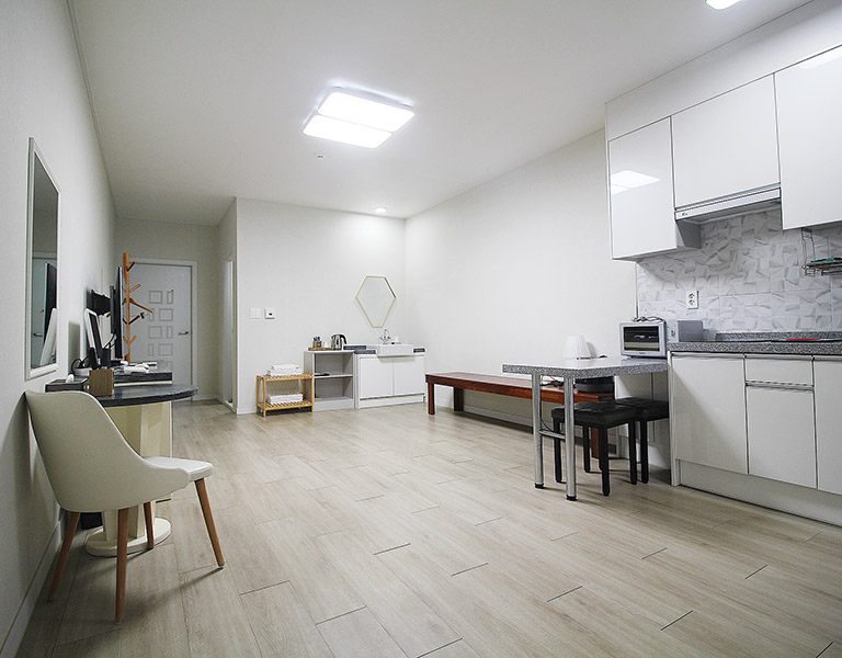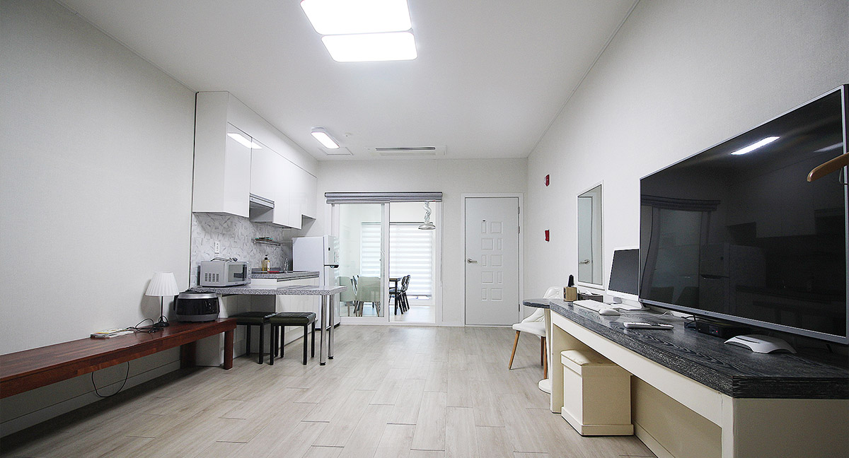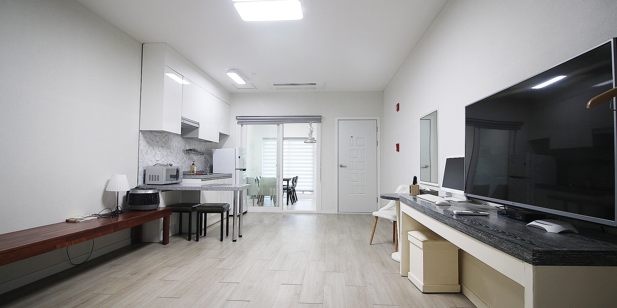 TV, 침대, 식탁, 에어컨, PC, 커피포트, 전기밥솥, 전자렌지, 조리도구일체, 식기일체, 수건, 용품일체 등