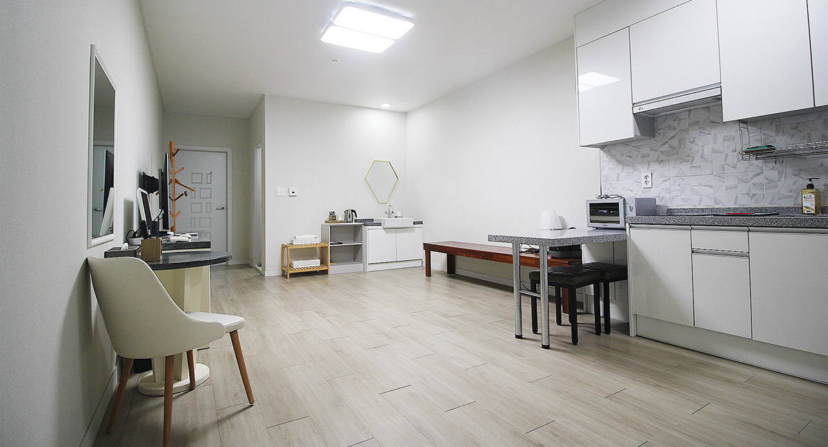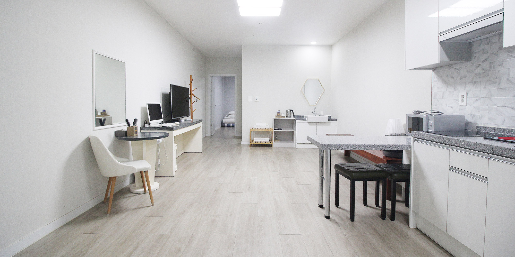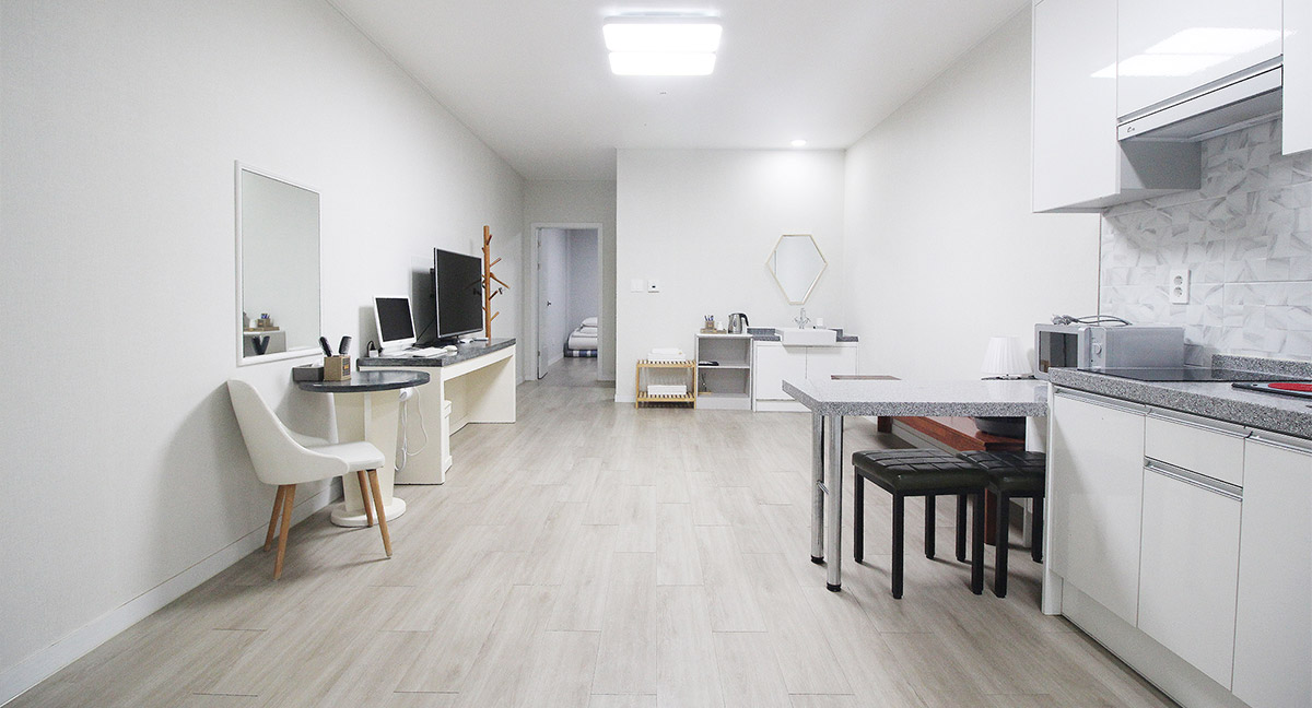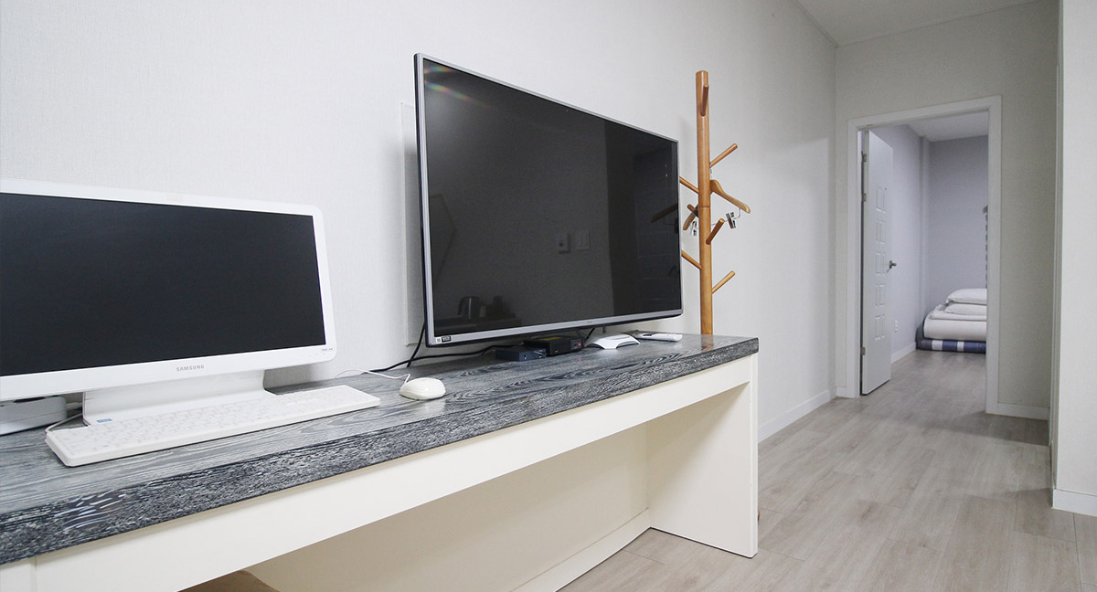 TV, 침대, 식탁, 에어컨, PC, 커피포트, 전기밥솥, 전자렌지, 조리도구일체, 식기일체, 수건, 용품일체 등